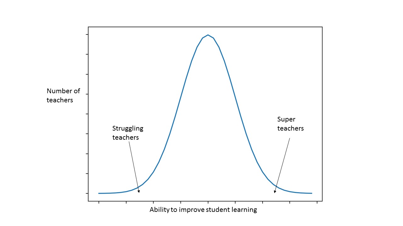 I’m going to get a bit controversial now. Let’s say instead of counting everybody in the world, we took teachers. And instead of looking at their height or weight or heart rate we looked at their “ability to improve student learning.” I imagine we would also get a normal distribution. The overwhelming majority of teachers would be close together in terms of their ability to improve student learning. Some would be way out there on the right – the super teachers who are just brilliant – and some, sadly, would be way out there on the left – the teachers who don’t quite seem to be hitting the right notes.