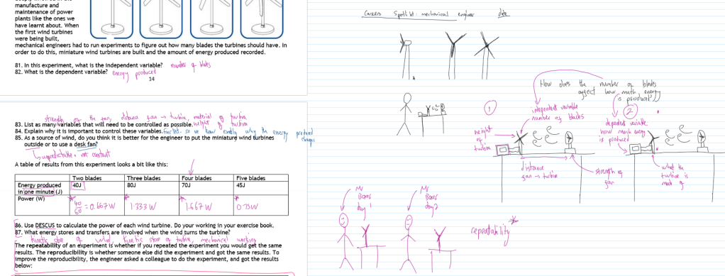 OneNote is a Microsoft app that is basically a glorified notebook. You can have different sections and add different pages to your sections. You can type or write directly into those sections, as well as insert media like pictures, videos, a slide deck or even a booklet. That page can then be shared with an individual (who can then see and edit it) or a class (if you are set up with Microsoft Teams). Graphics tablets and 2-in-1 laptops allow you to digitally write onto your notebook, and the end of a unit might look something like this: